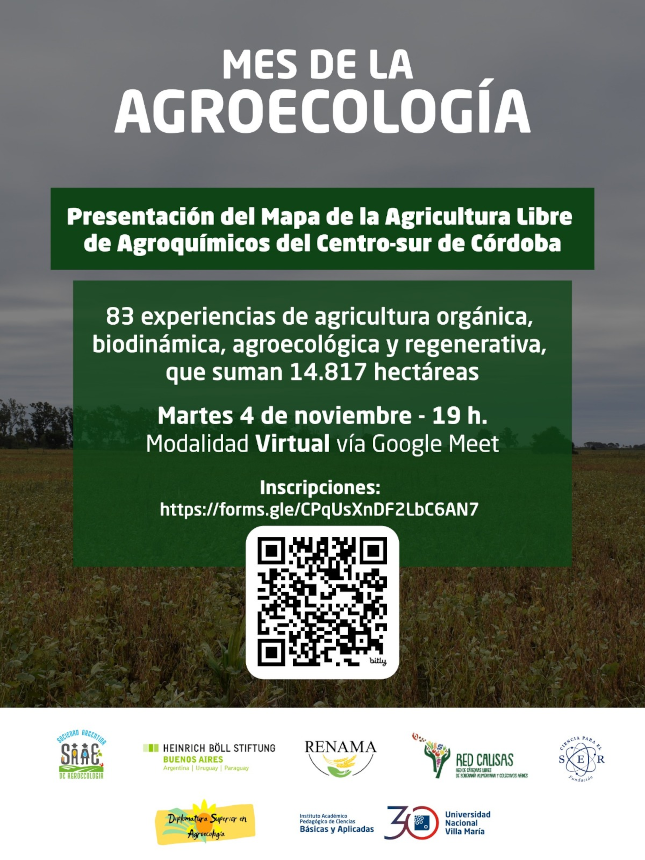 Mapa de la Agricultura Libre de Agroquímicos (ALdeA) del centro-sur de Córdoba El mapa de la Agricultura Libre de Agroquímicos (ALdeA) del centro-sur de Córdoba es un trabajo conjunto entre la cátedra de Ecología de Agronomía de la Universidad Nacional de Villa María (UNVM) y la cátedra de Agriculturas Alternativas de Ingeniería Agronómica de la Universidad Nacional de Río Cuarto. Ofrece información básica y georeferenciada de campos regionales que han optado por las prácticas agroecológicas, orgánicas, biodinámicas, permaculturales y regenerativas. Se relevaron 83 campos, que ocupan una superficie de 14.817,54 hectáreas. Es una herramienta de acceso libre. Mediante este mapa se accede a la ubicación de cada campo, su superficie trabajada, sus actividades principales y secundarias, su antigüedad en la ALdeA, sus redes sociales, algunas imágenes de los mismos, videos y notas periodísticas sobre los campos y los medios (correo electrónico o teléfonos) para contactarlos. Inscripciones completando el formulario -> https://forms.gle/CPqUsXnDF2LbC6AN7